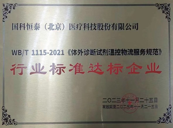2023年,国科恒泰被中国物流采购联合会医疗器械供应链分会评选为《体外诊断实际温控物流服务规范》行业标准达标企业;